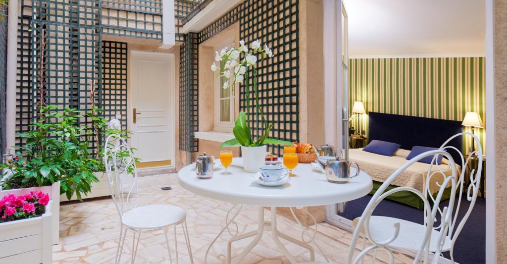 Old beams and traditional wall-hangings, china ornaments and brand new facilities… Like a cottage with a traditional French touch, the 28 renovated rooms are tastefully styled and have bathrooms with all modern conveniences. Every single one a gem! This is a world outside time with state-of-the-art services where you can retreat from the bustle of Paris in a beautiful environment…